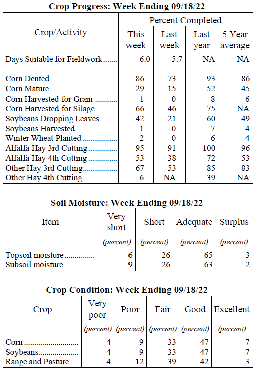 Harvest is underway in Indiana, though it has been minimal at this point. According to USDA NASS State Statistician Nathanial Warenski, ideal weather conditions last week aided dry down in corn and soybean fields, though the maturation of both crops still lagged behind their respective five-year averages.